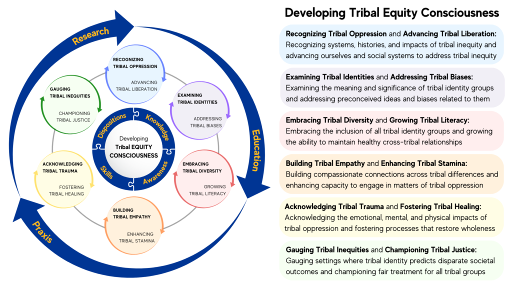 Through this dynamic resource hub, users are invited to explore the core spheres of the tribal equity consciousness framework. The goal is to build the skills and motivation needed to appreciate different perspectives, to elevate cultural humility and competence, and to empower bold visions and commitments to inclusive, equitable communities. Here, learners and teachers alike can grow their confidence and develop the mindset to become innovative, action-oriented agents for transformative social change.